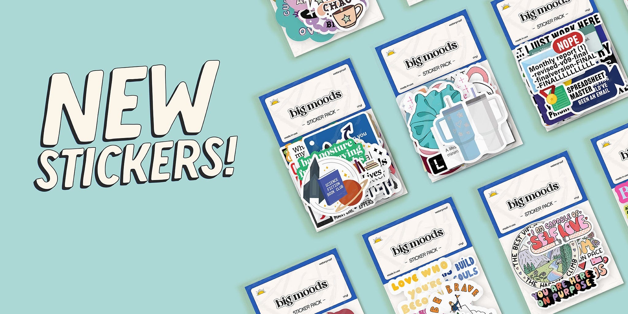 Our customers love putting Big Moods vinyl stickers on their laptops, water bottles, phone cases, car windows, coolers, suitcases, journals, planners, tablets, kayaks, picture frames, windows, greeting cards, and more.