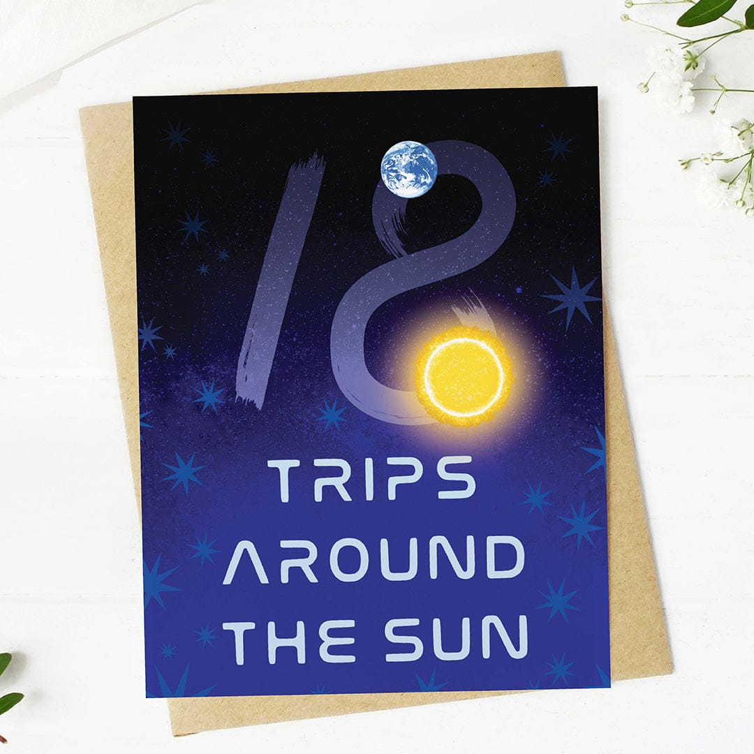 Mark 18 years of memories with this thoughtful "18th trips around the sun" birthday card.