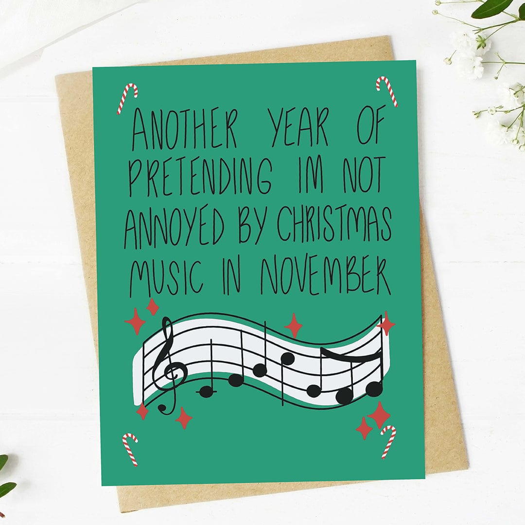All I want for Christmas is... to not hear Christmas music in November! Share your disdain for early Christmas music with this funny card which reads "another year of pretending I'm not annoyed by Christmas music in November"