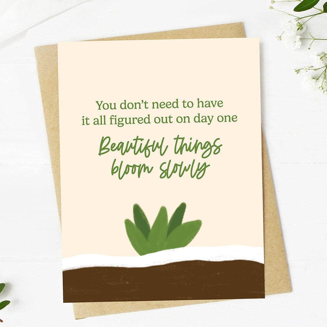 Send a reassuring message to someone who needs to hear it. This encouragement card gently reminds us "you don't need to have it all figured out on day one. Beautiful things bloom slowly"