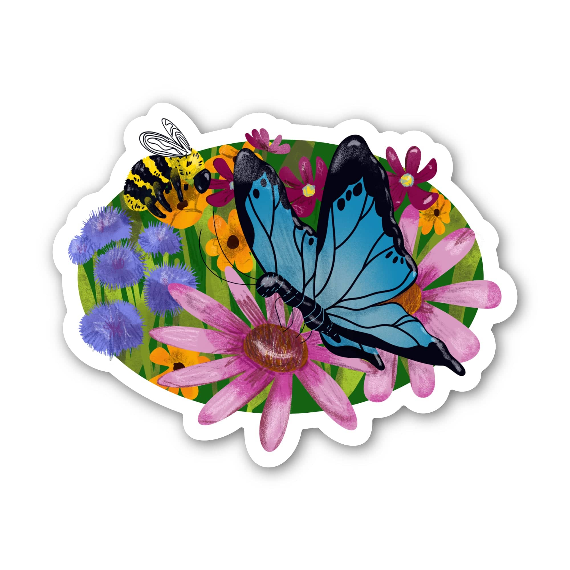 Capture the beauty of the outdoors with this bee and butterfly garden sticker. Transform your laptop or notebook into a blooming meadow! High quality vinyl sticker. Great to decorate laptops, water bottles, car windows, coolers, suitcases, bikes, kayaks, phone cases, journals, and more.