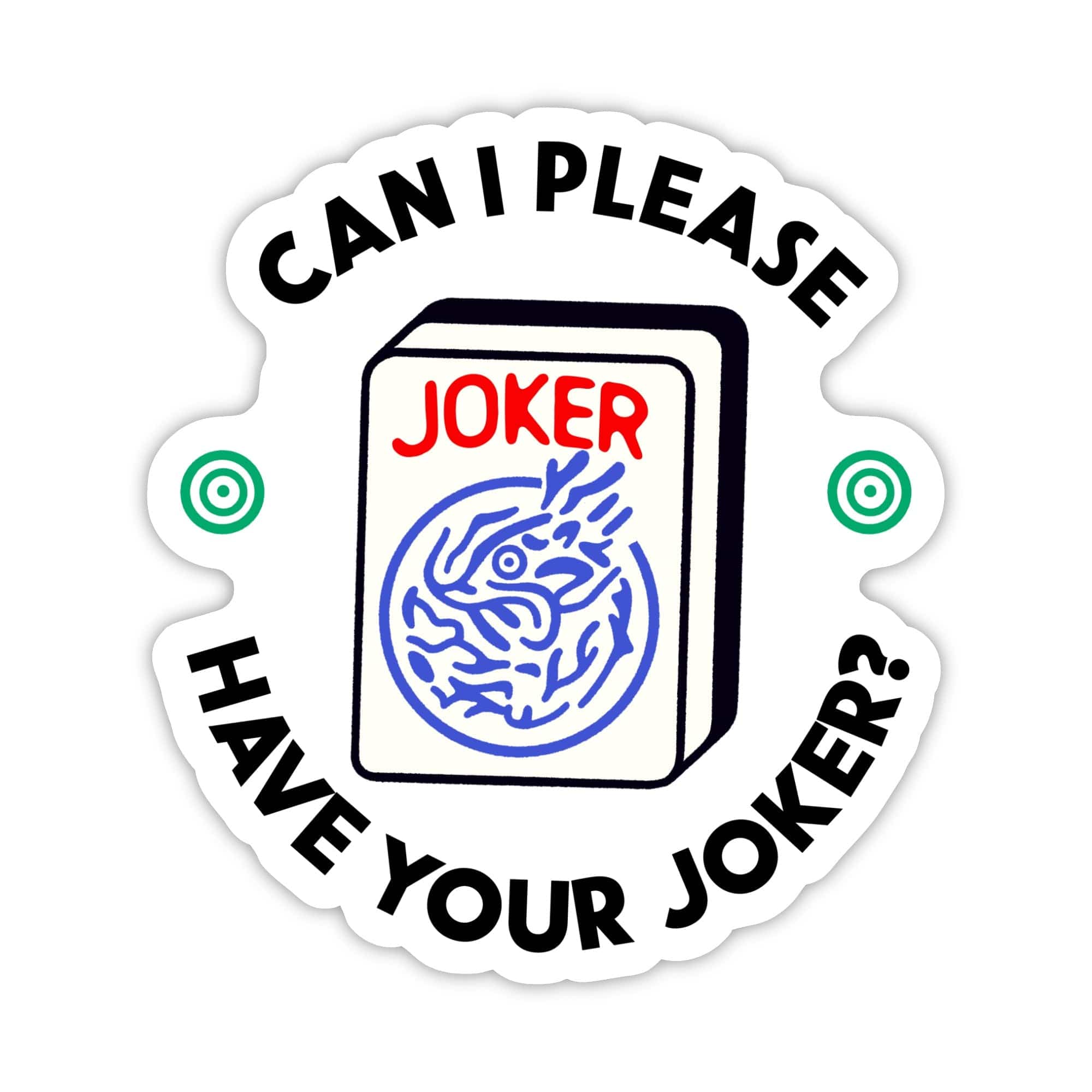 Share your love of mahjong with our "can i please have your joker? mahjong sticker" - perfect for game night or gifting to your favorite mahj partner! High quality vinyl sticker. Great to decorate laptops, water bottles, car windows, coolers, suitcases, bikes, kayaks, phone cases, journals, and more.
