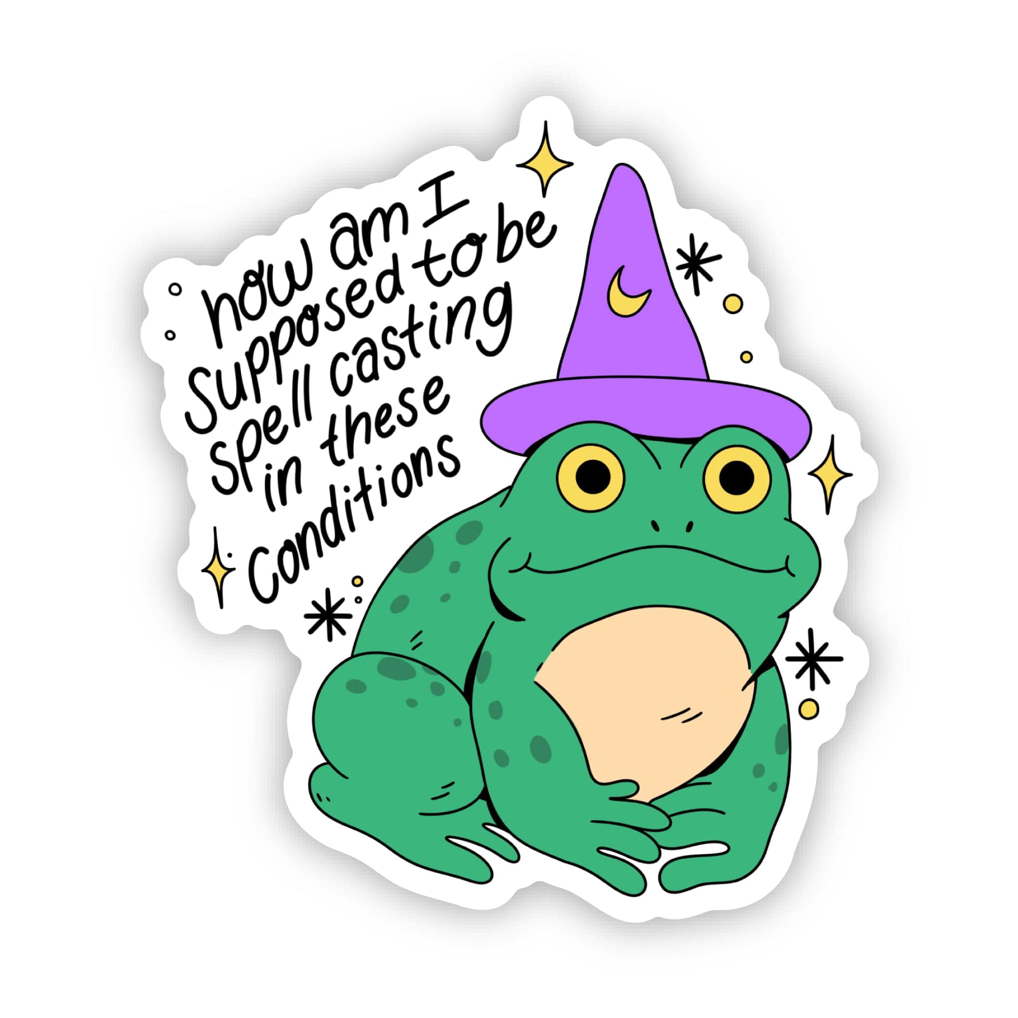 Casting spells, in this economy? Make life a little more fun with this cute "how am I supposed to be casting spells in these conditions" witchy frog sticker. High quality vinyl sticker. Great to decorate laptops, water bottles, car windows, coolers, suitcases, bikes, kayaks, phone cases, journals, and more.