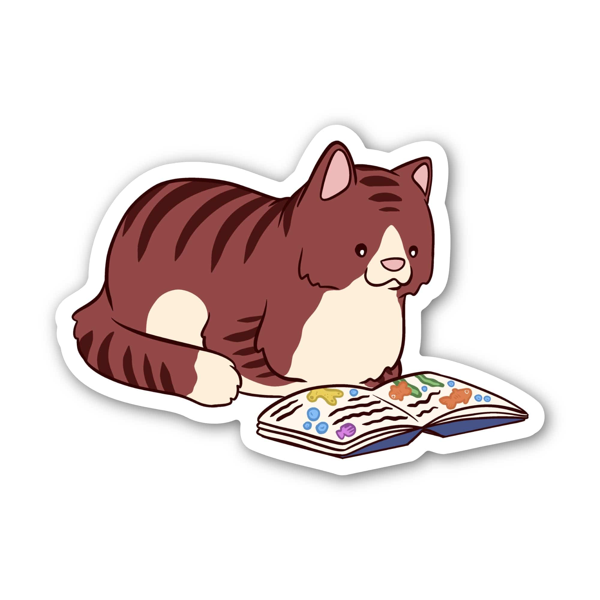 Add a playful touch to your collection with this adorable cat reading book sticker - perfect for lovers of cats and reading! High quality vinyl sticker. Great to decorate laptops, water bottles, car windows, coolers, suitcases, bikes, kayaks, phone cases, journals, and more.