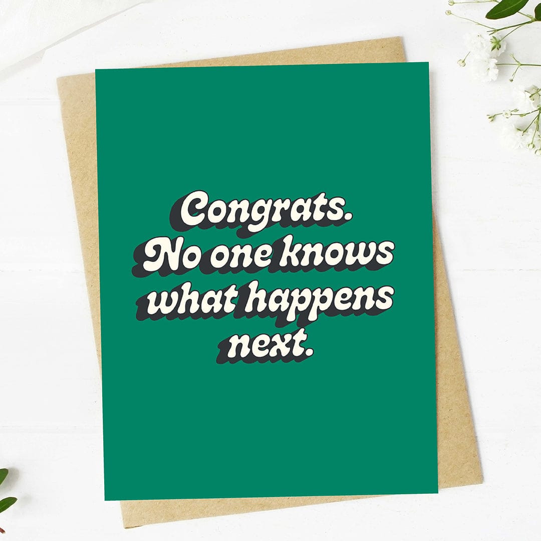 Welcome a new graduate to the uncertain adventure ahead with this honest but funny greeting card which reads "congrats. no one know what happens next"