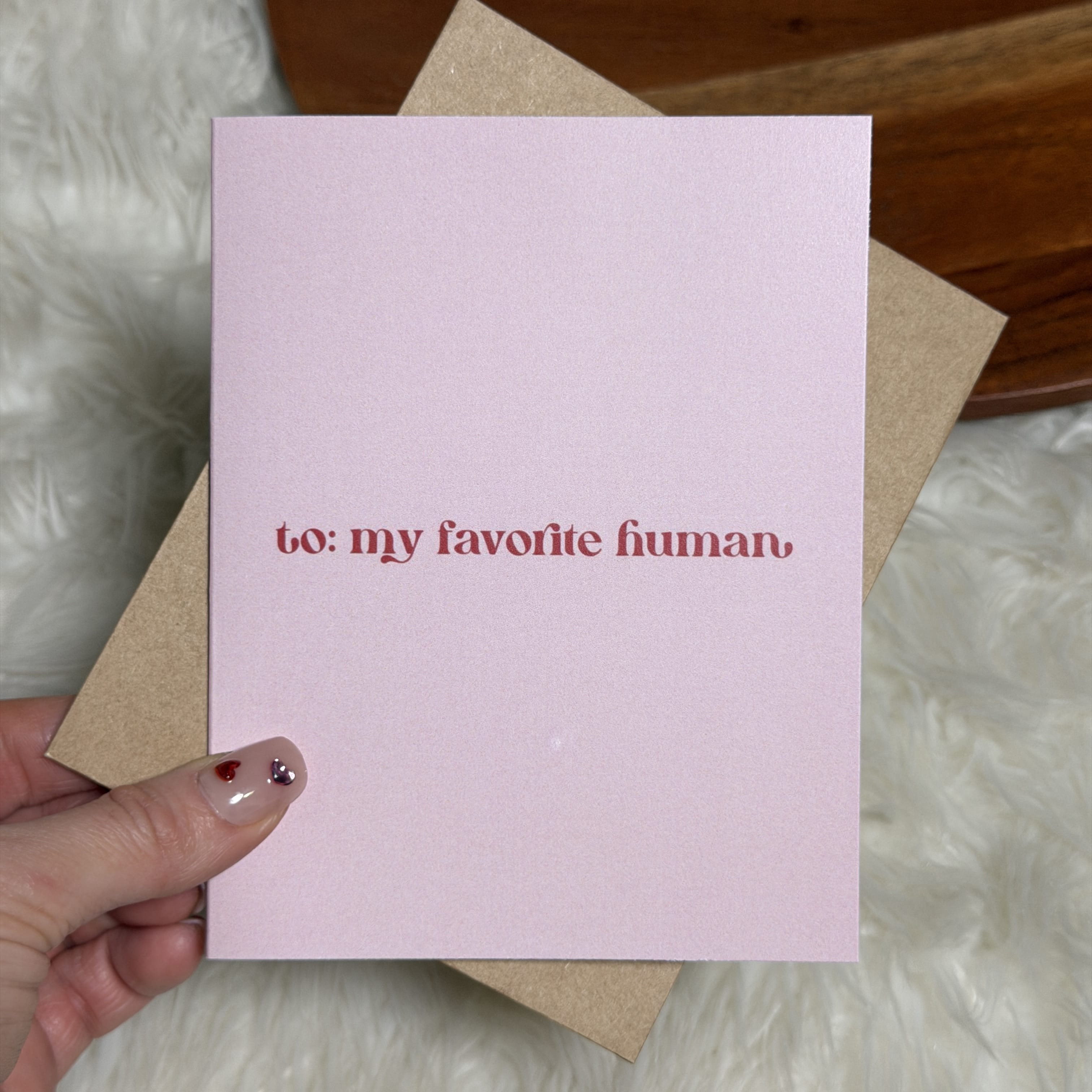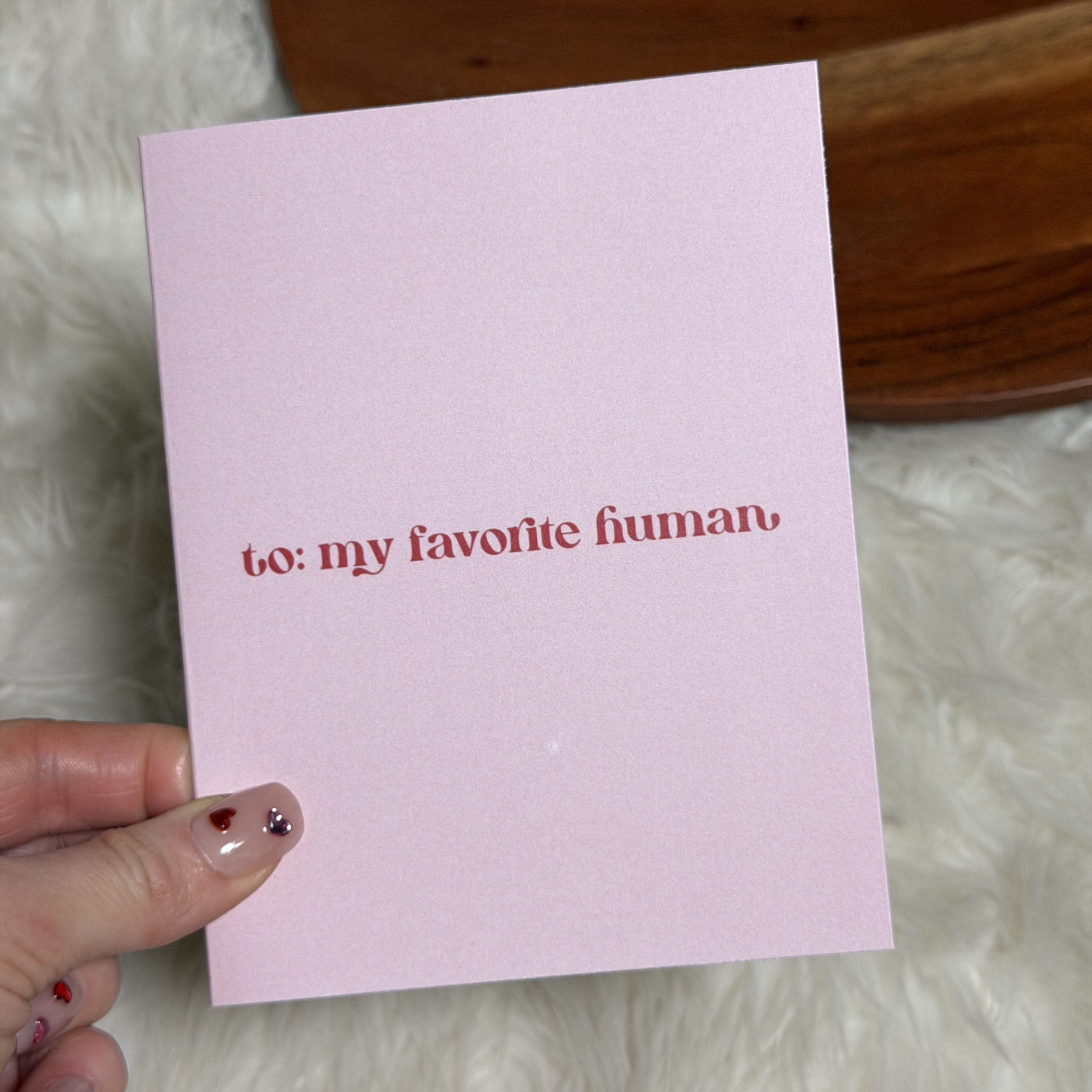 Celebrate a love-filled Valentine's Day with this adorable "to: my favorite human" greeting card.