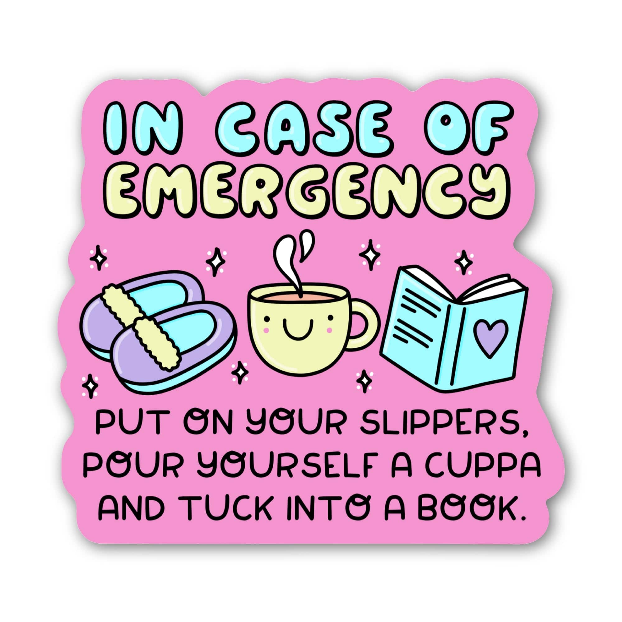 Get this self care emergency fun sticker to ensure you know what to do in an emergency... put on your slippers, pour yourself a cuppa and tuck into a book. High quality vinyl sticker. Great to decorate laptops, water bottles, car windows, coolers, suitcases, bikes, kayaks, phone cases, journals, and more.