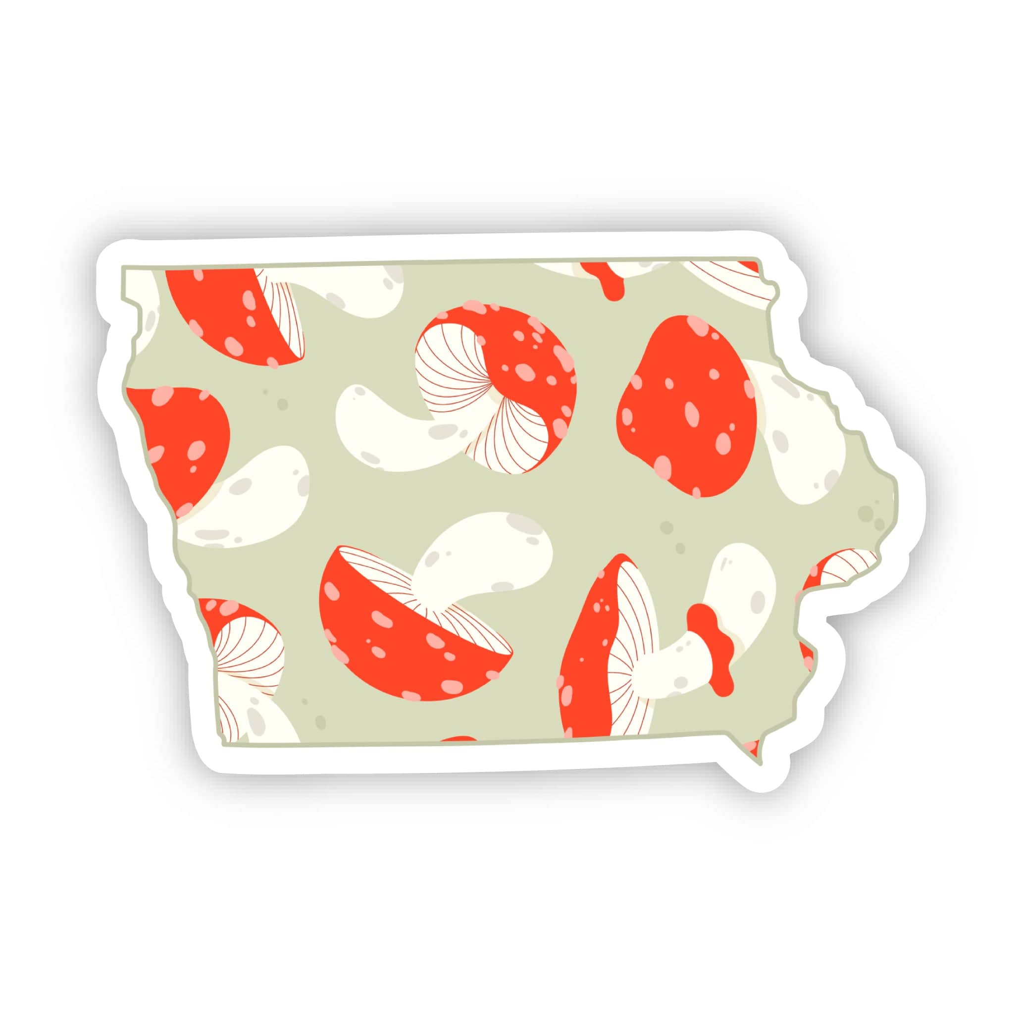 Share your fun side with our mushroom pattern state stickers. If you love nature and the state of Iowa, this sticker is for you! High quality vinyl sticker. Great to decorate laptops, water bottles, car windows, coolers, suitcases, bikes, kayaks, phone cases, journals, and more.