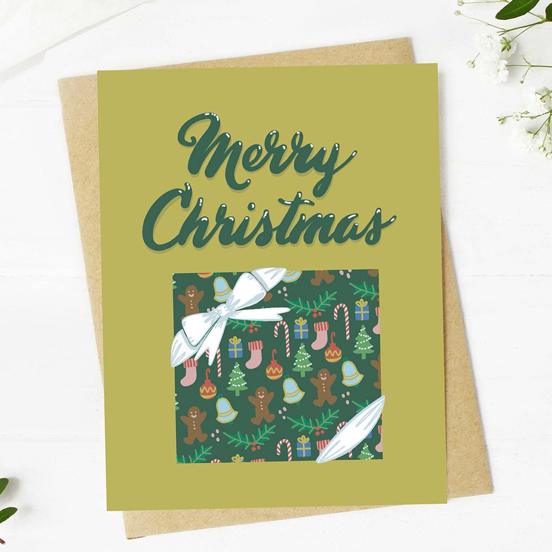 Get in the holiday spirit with our ribbon-wrapped Christmas present card, featuring playful holiday icons and plenty of cheer.