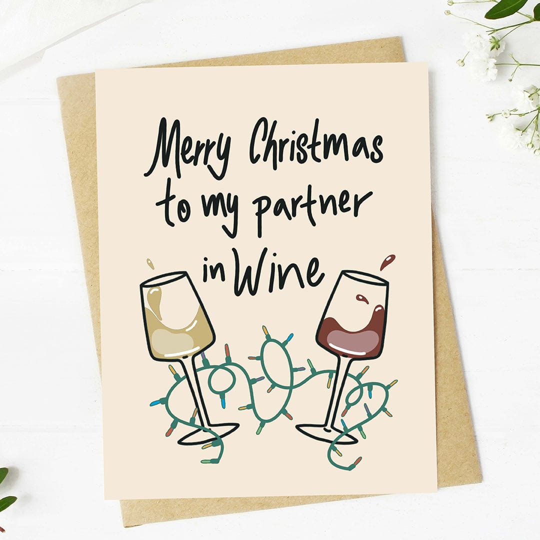 Share season's greetings with the one you love to share a glass with! Gift our "merry Christmas to my partner in wine" greeting card this holiday season.
