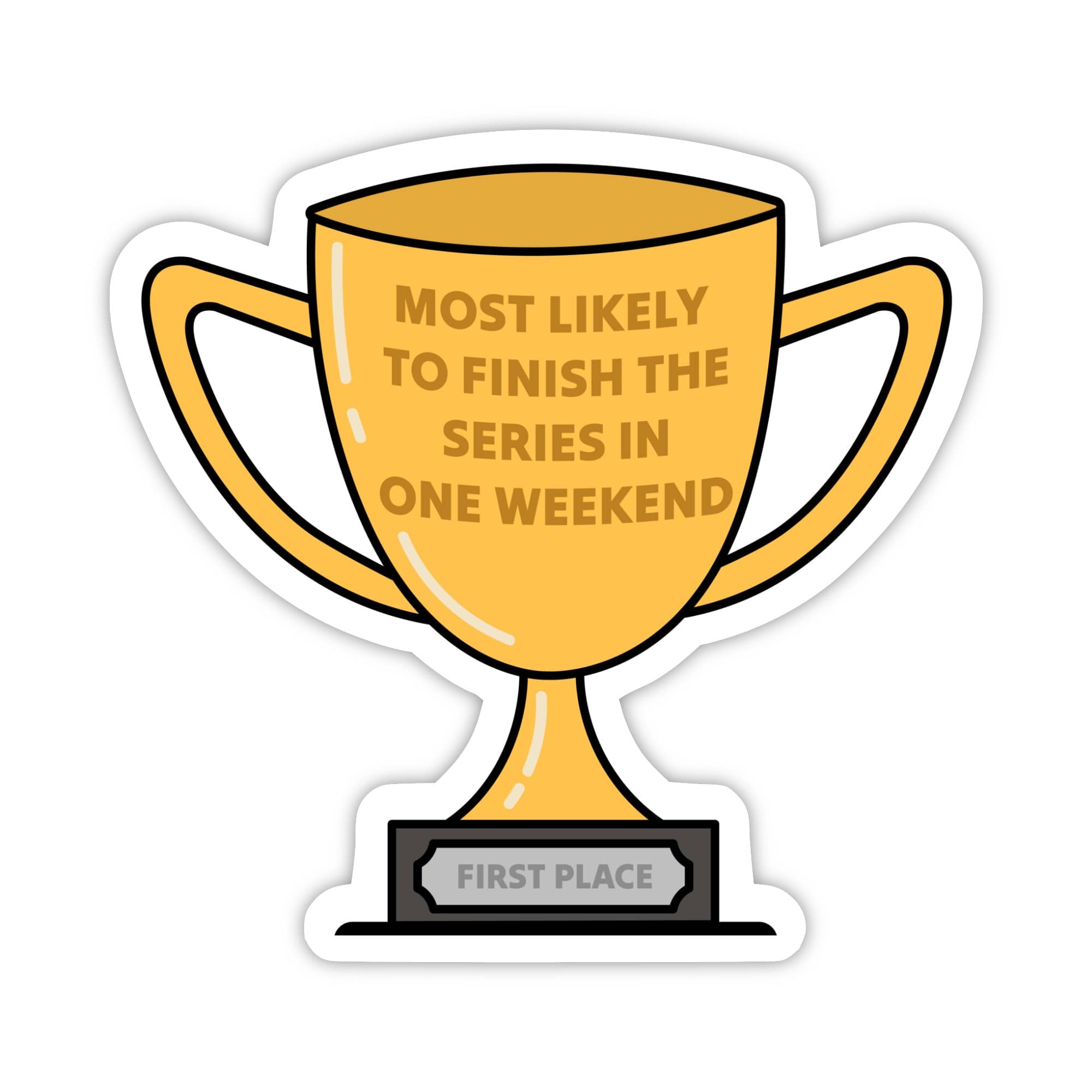This sticker is made for that person in your life who is most likely to finish the series in one weekend - gift them this trophy sticker which awards them first place! High quality vinyl sticker. Great to decorate laptops, water bottles, car windows, coolers, suitcases, bikes, kayaks, phone cases, journals, and more.