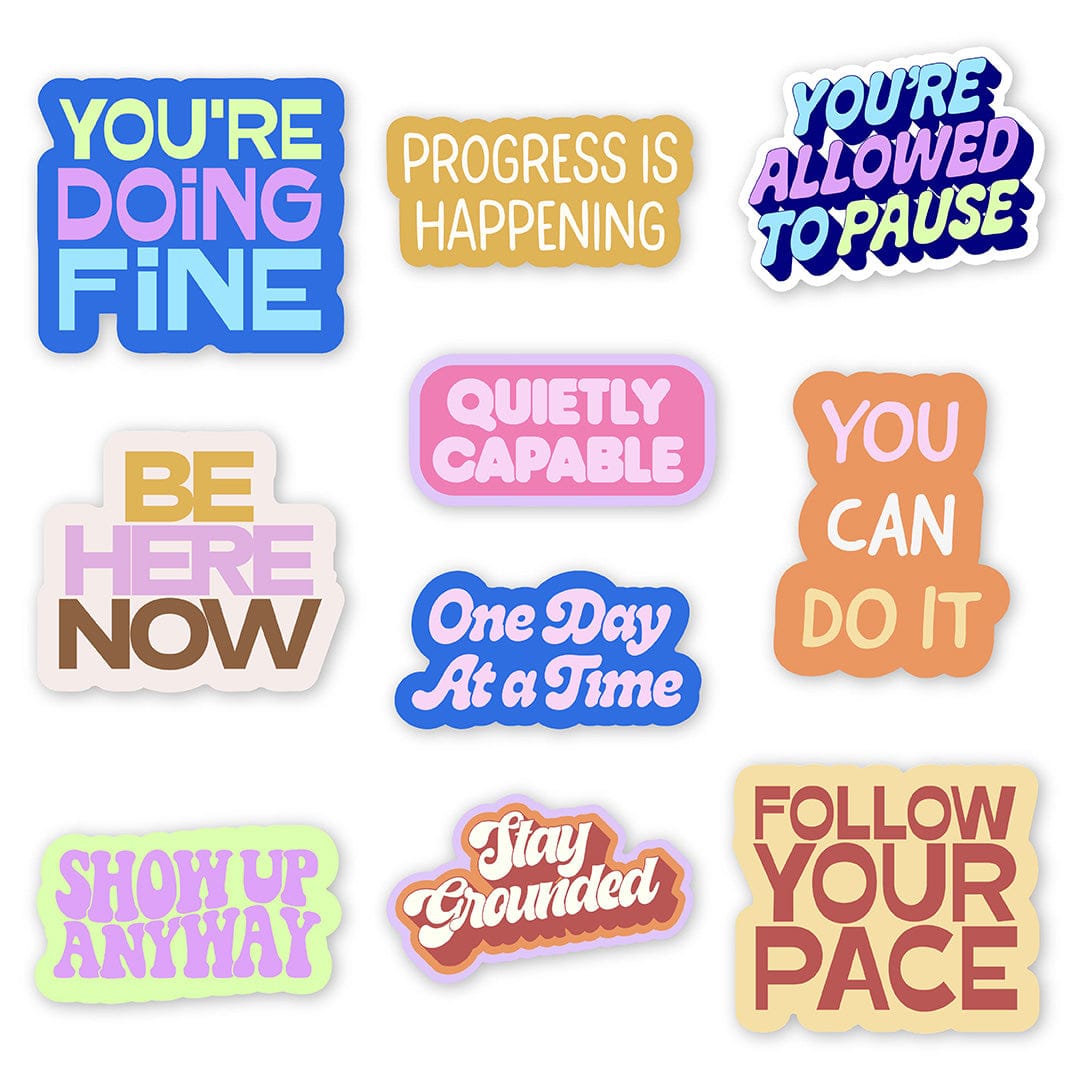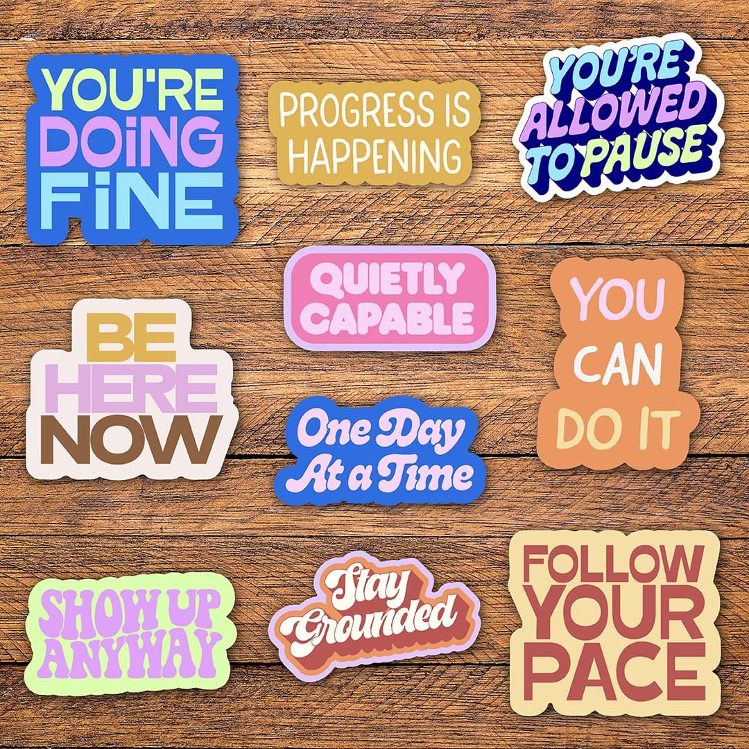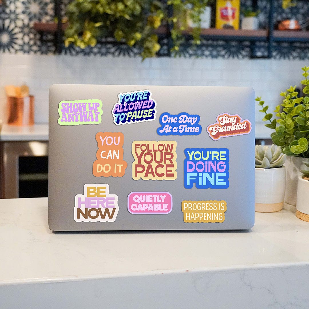 Stay motivated with our mental health sticker pack - here to remind you to take one day at a time and to stay grounded. Add this motivational text sticker pack to your collection!
