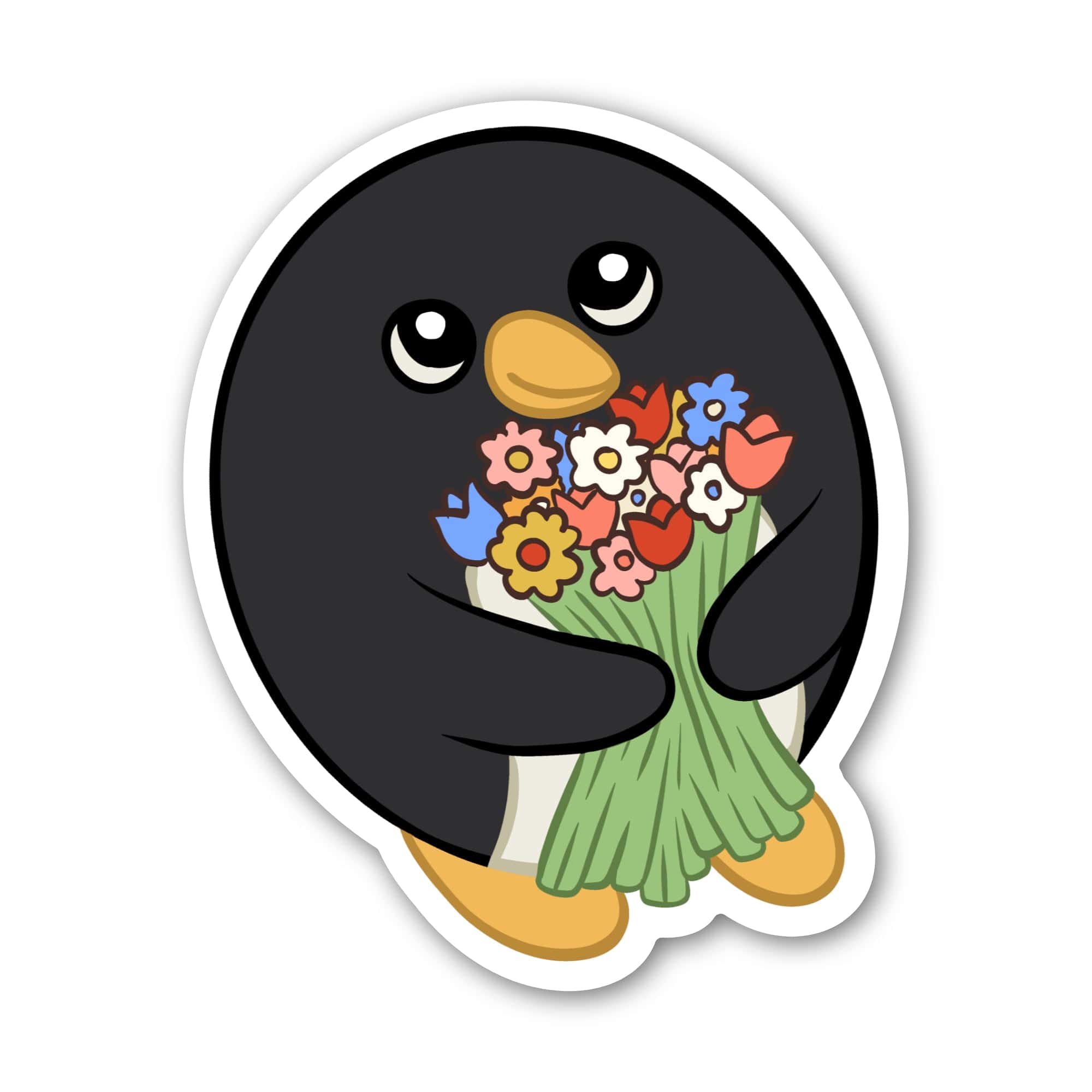 Share some joy with this adorable penguin holding a flower bouquet sticker. High quality vinyl sticker. Great to decorate laptops, water bottles, car windows, coolers, suitcases, bikes, kayaks, phone cases, journals, and more.