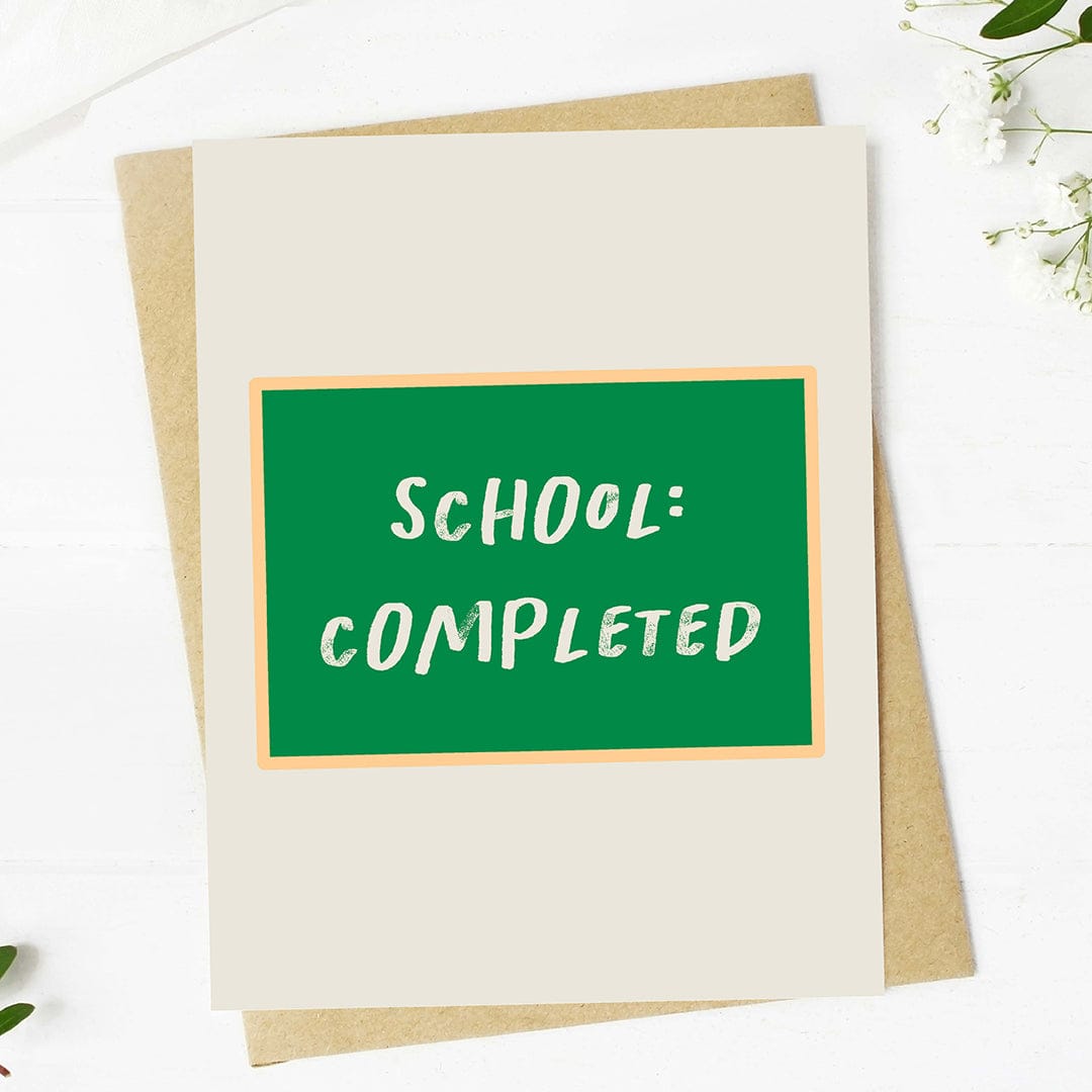 Celebrate checking off a major life milestone with our "school: completed" chalkboard graduation card.