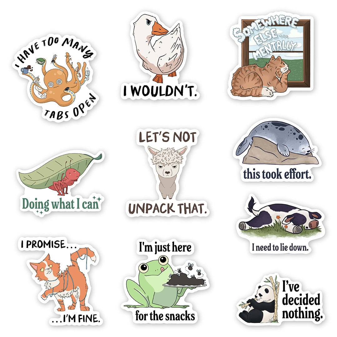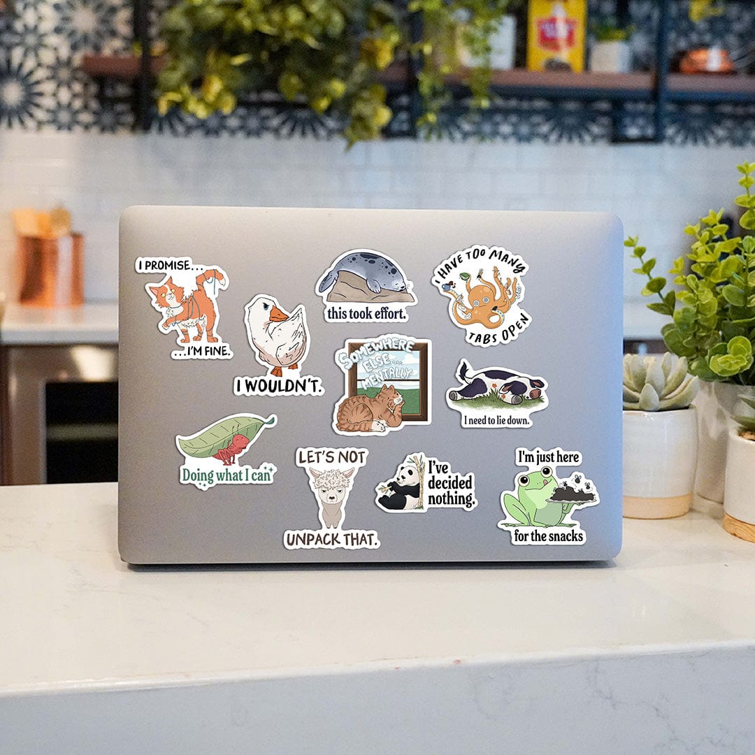 Whether you are "doing what you can" ant, "I'm just here for the snacks" frog, or "somewhere else mentally" cat... Our relatable funny animal stickers are guaranteed to spread happiness wherever you take them.