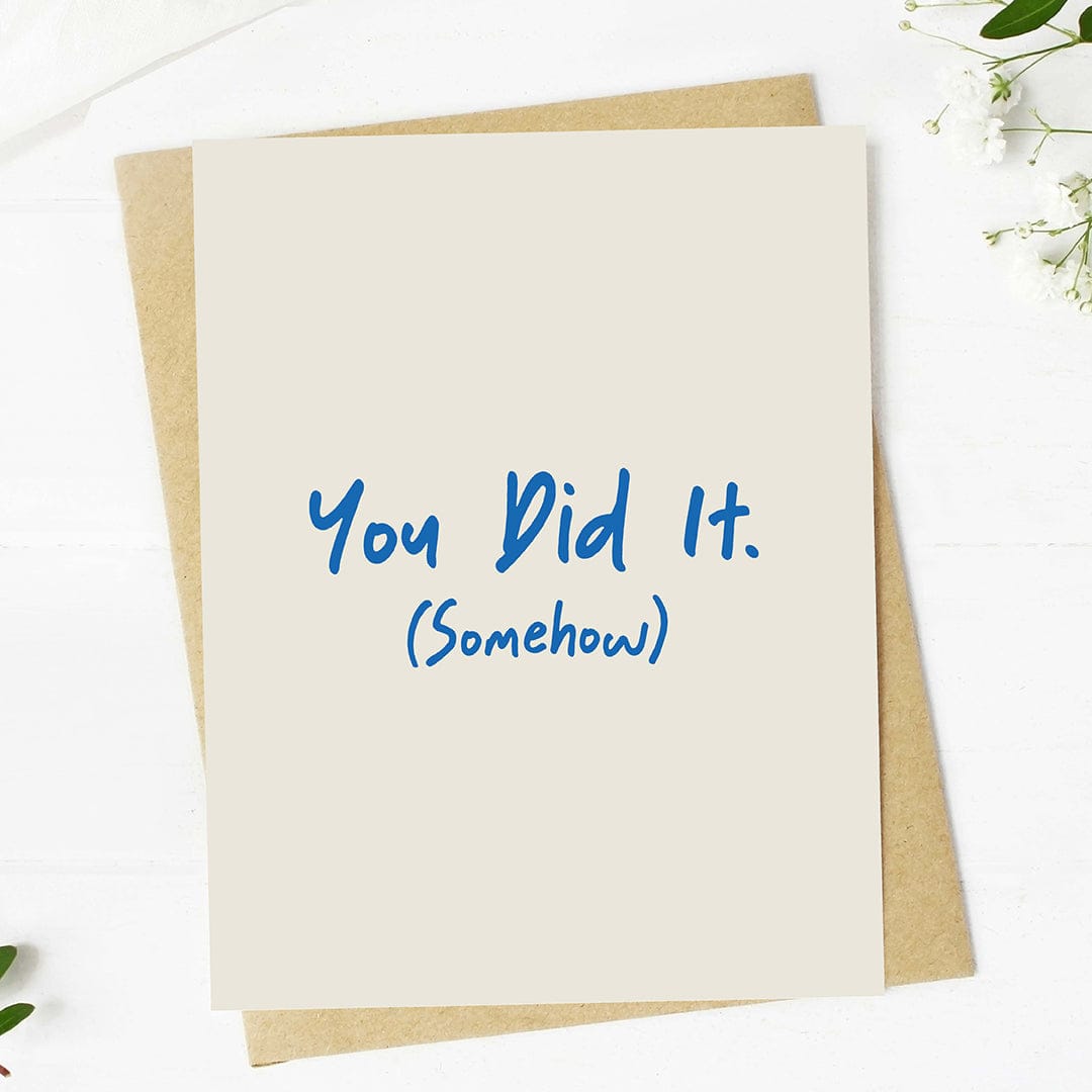 Gift this funny card to someone who made it to graduation despite everything! Graduation card reads "you did it (somehow)"