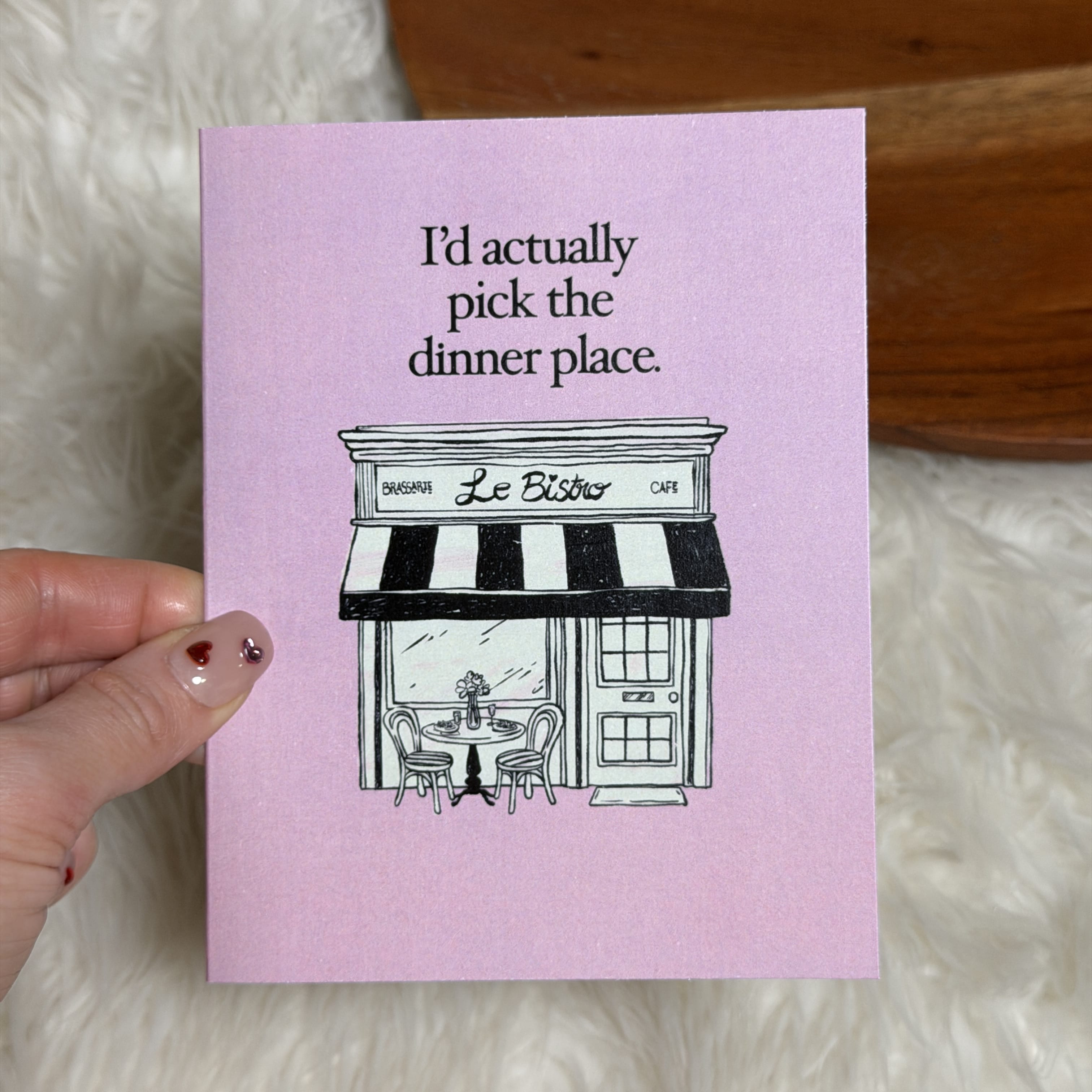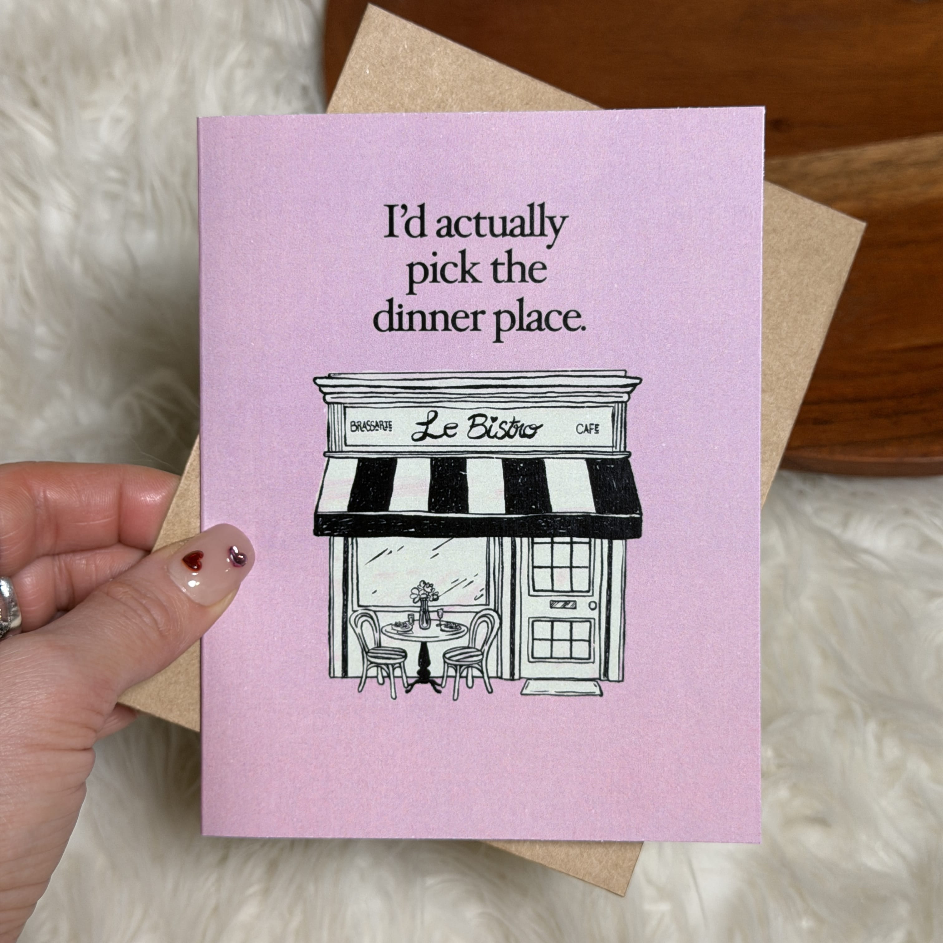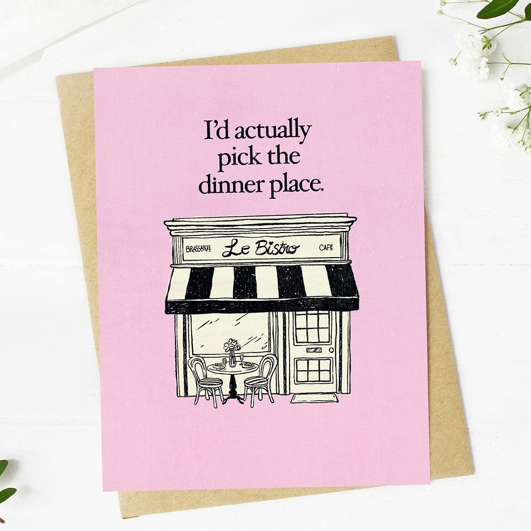 Let your loved one know just how much you love them with this fun "I'd actually pick the dinner place" bistro Valentine's day greeting card.