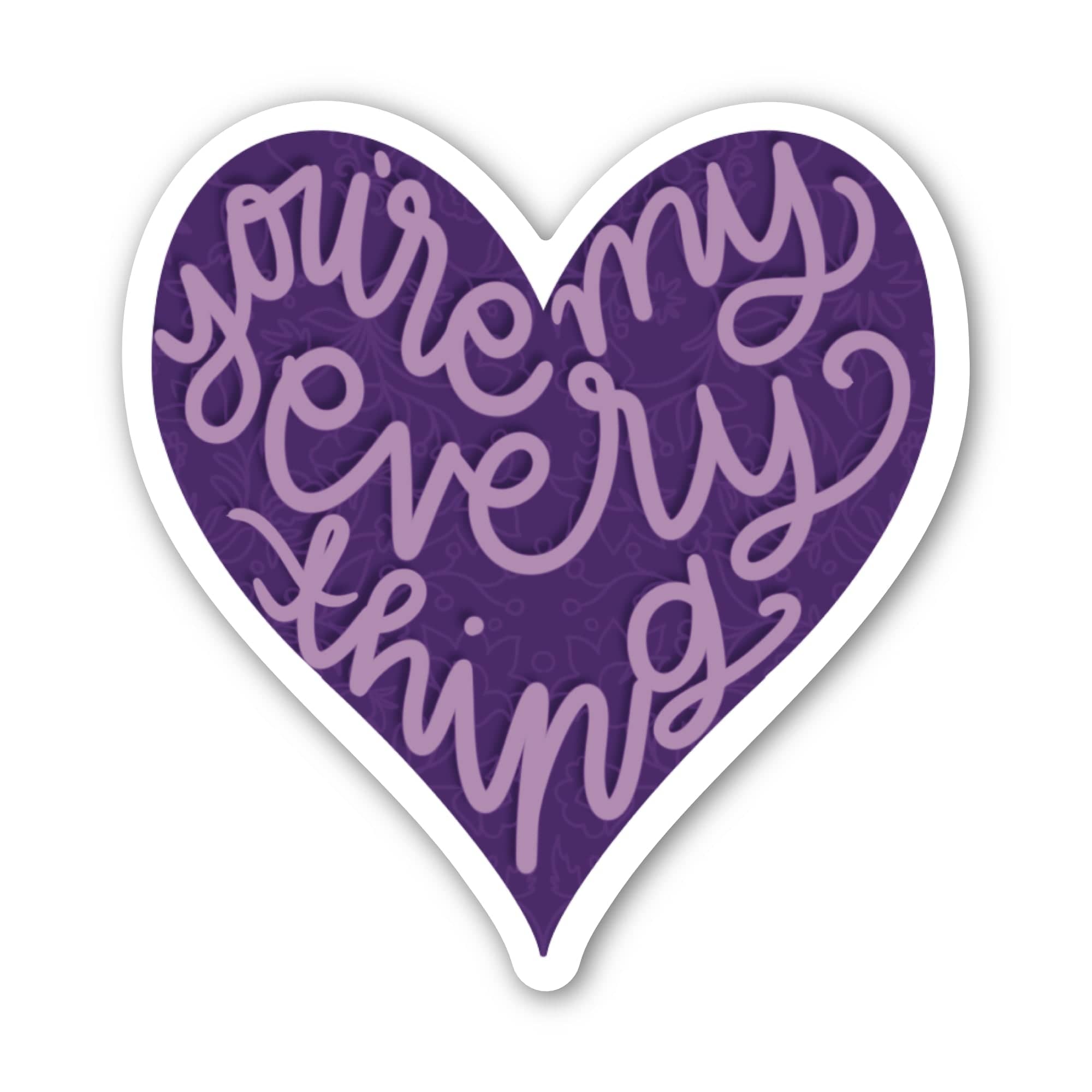 Celebrate your special someone with this "you're my everything" heart sticker! Birhgten their day with this heartfelt symbol of love. High quality vinyl sticker. Great to decorate laptops, water bottles, car windows, coolers, suitcases, bikes, kayaks, phone cases, journals, and more.
